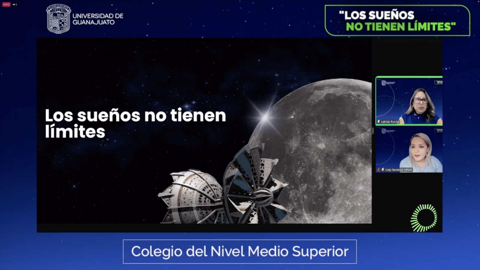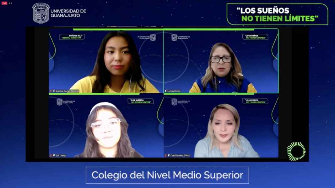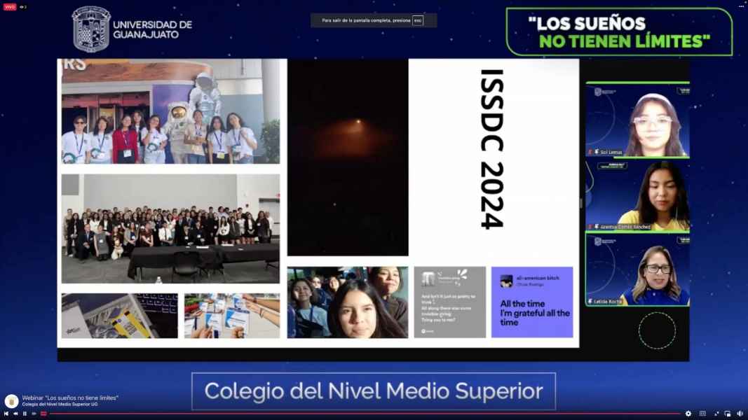 Guanajuato, Gto., a 18 de octubre de 2024.- Se llevó a cabo el webinar Los sueños no tienen límites, organizado por el Colegio del Nivel Medio Superior (CNMS UG), donde las ex alumnas de la Escuela del Nivel Medio Superior Centro Histórico León, Aranxta Sánchez Cortés y Mayra Soledad Becerra Lemus, acompañadas de la CEO de SPACEPORT MX, Mtra. Catalina Ramírez, sostuvieron una charla llena de aprendizajes y anécdotas vividas en el marco de la Competencia Internacional de Diseño de Hábitats Espaciales (International Space Settlement Design Competition), evento desarrollado en el Centro Espacial John F. Kennedy de la Administración Nacional de Aeronáutica y el Espacio de Estados Unidos (NASA), en Florida del 26 al 29 de julio del año en curso.