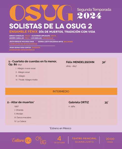 El Ensamble Fénix ofrecerá un repertorio que celebrará la riqueza cultural de esta tradición mexicana, en donde se fusionará la música y un homenaje a las personas que han partido con piezas de Félix Mendelssohn con “Cuarteto en Fa menor Op.80”, además de “Altar de muertos” de Gabriela Ortiz.