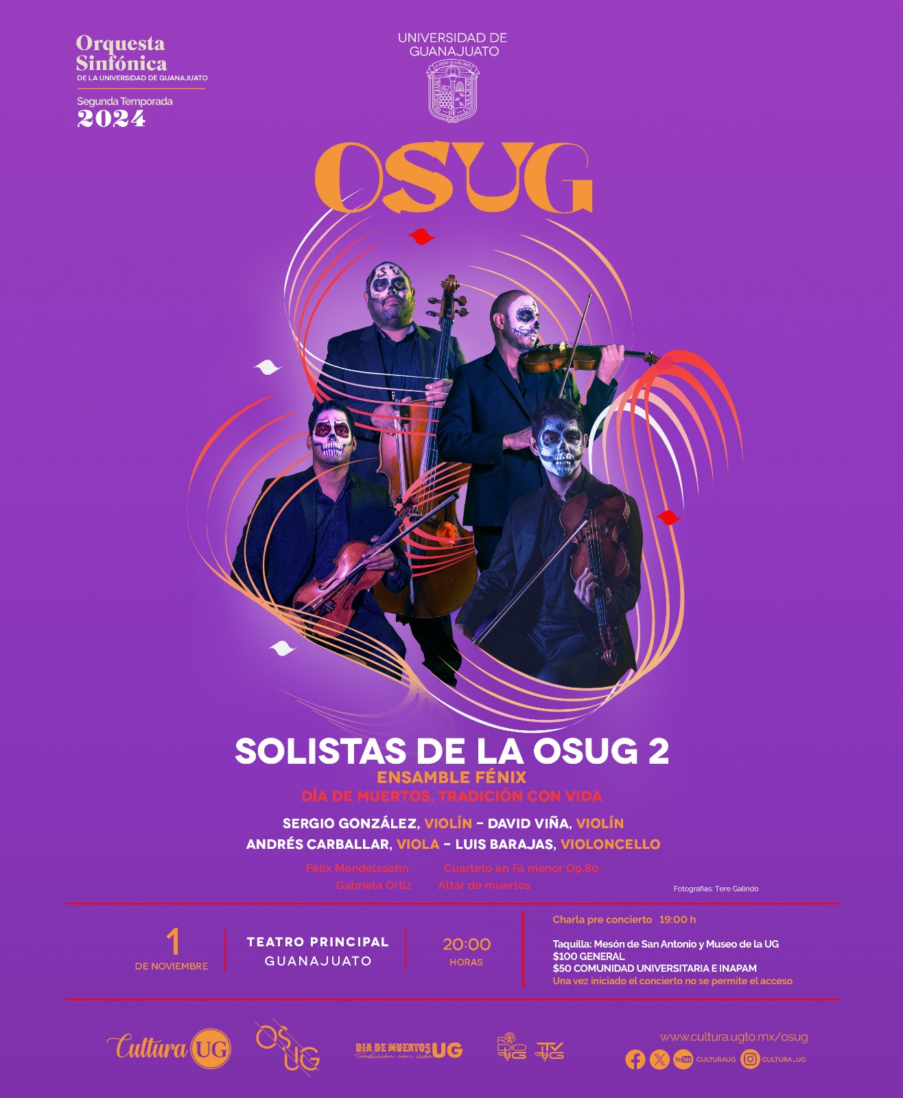 Guanajuato, Gto., a 31 de octubre de 2024.- En el marco de la celebración del tradicional día de muertos y bajo el nombre “Programa día de muertos, tradición con la vida” se presentará el Ensamble Fénix, como parte de los Solistas de la Orquesta Sinfónica de la Universidad de Guanajuato (OSUG), este 01 de noviembre en el Teatro Principal en punto de las 20:00 hrs.