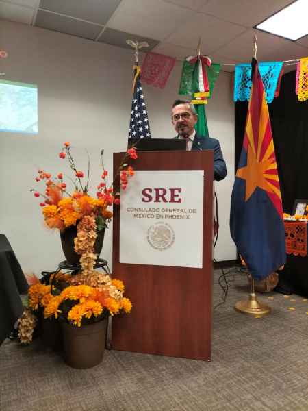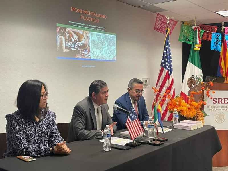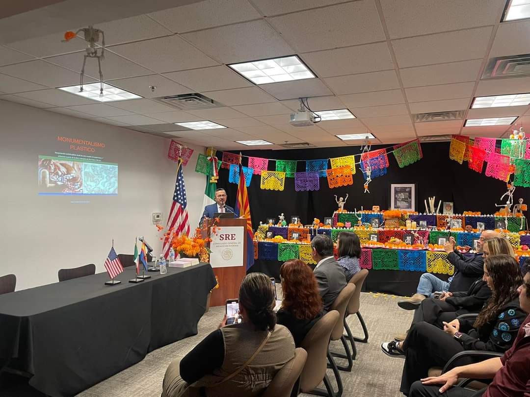 Guanajuato, Gto., a 07 de noviembre de 2024.- Se presentó en el Consulado de México en Phoenix (EUA), el libro “José Chávez Morado y el Monumentalismo plástico”, proyecto editorial que examina el Muralismo, considerado el principal movimiento artístico que posicionó a México en el escenario mundial de la pintura durante el siglo XX.