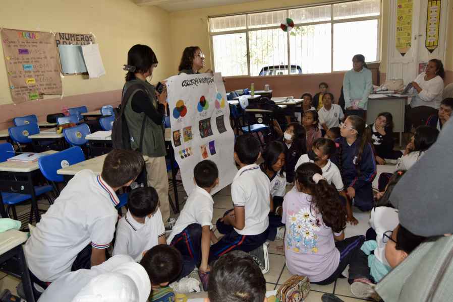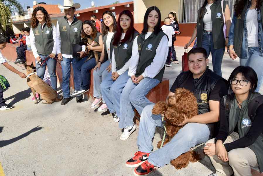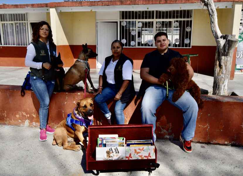 La actividad inició en la escuela primaria Gustavo Díaz Ordaz, en la colonia Jardines de Jerez, donde arribaron con Damane, Atenea, Kali y Canelo, canes entrenados para convivir pacientemente con las y los menores.