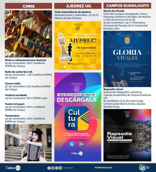 En este mismo foro, se dará muestra del baile de salón “Son UG” el 26 de noviembre a las 18:00 horas. También tres grupos teatrales: Clown Smile, el 27 de noviembre a las 18:00 horas; Teatro Arlequín, el 29 de noviembre a las 18:00 horas, y Pantomima, el 30 de noviembre a las 18:00 horas.