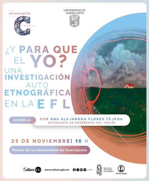 La charla “¿Y para qué el yo? Una investigación auto etnográfica en la EFL”, de Ana Alejandra Flores Tejeda, estudiante de Enseñanza del Inglés, se impartirá el 25 de noviembre a las 18:00 horas en el Museo de la UG.