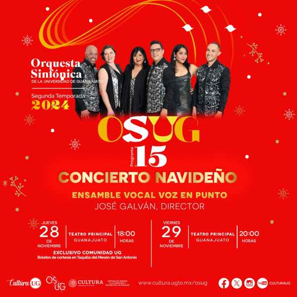 Además, el concierto contará con la participación del Ensamble Vocal Voz en punto, bajo la batuta de José Galván, y el Ensamble Coral de la Universidad de Guanajuato, dirigido por los maestros José Francisco Martínez y Félix Benjamín Torres, quienes interpretarán una serie de piezas representativas de la calidez y la armonía de la temporada decembrina.