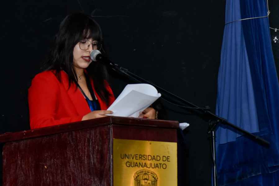 En representación de la comunidad universitaria reconocida dirigió mensaje la alumna de la licenciatura en Cultura y Arte, Paloma Almaguer Roldán quien hizo un recuento de agradecimientos y opiniones de varias y varios compañeros, así como de todas las personas que le han acompañado durante su trayectoria.