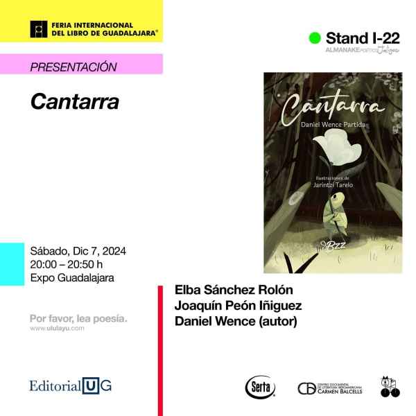 El ciclo de presentaciones concluirá el sábado 7 de diciembre a las 20:00 horas, con la presentación de Cantarra, de Daniel Wence, libro dirigido al público infantil con ilustraciones de Jarintzi Tarelo, donde participarán la Dra. Elba Sánchez Rolón, Titular del PEU, y Joaquín Peón Íñiguez en el stand de Almanake poético (stand I-20 del área nacional). Esta obra constituye también el primer audiolibro publicado por la UG.