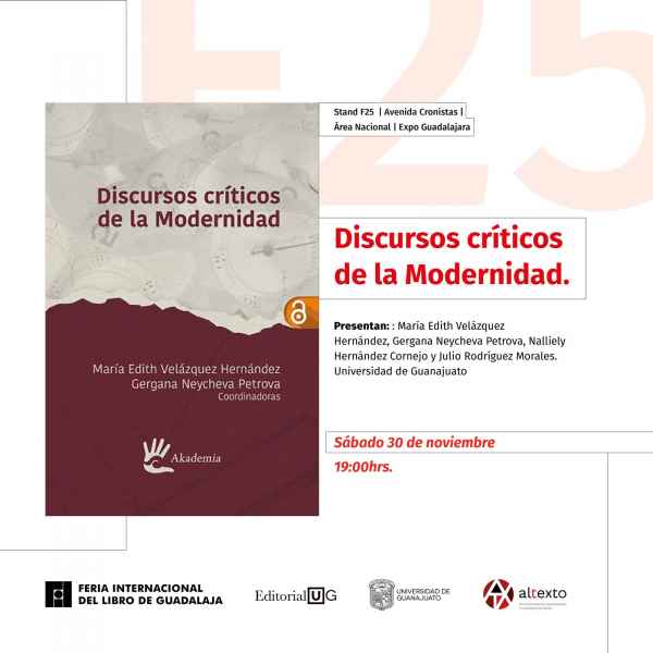 El mismo día a las 19:00 horas, la Dra. María Edith Velázquez Hernández y la Dra. Gergana Petrova, ambas coordinadoras, conversarán sobre Discursos críticos de la modernidad, en compañía de la Dra. Nalliely Hernández Cornejo y el Dr. Julio Rodríguez Morales.