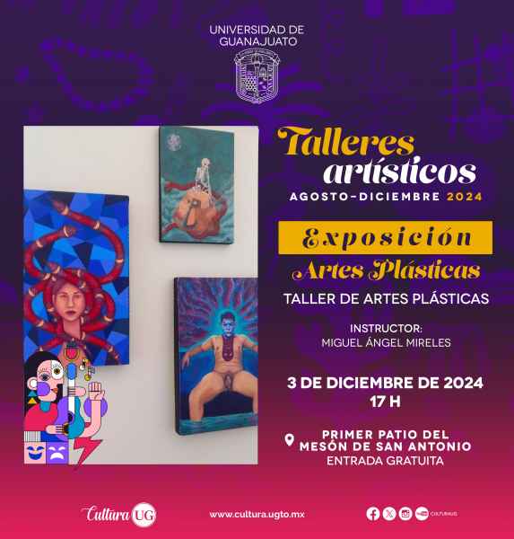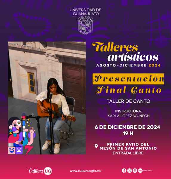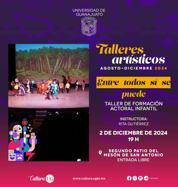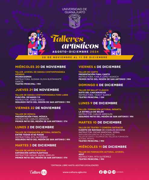 Guanajuato, Gto., a 29 de noviembre de 2024.- Con el objetivo de difundir los logros alcanzados por las y los alumnos de los Talleres Artísticos de la Universidad de Guanajuato (UG), del 2 al 11 de diciembre se dará muestra de lo aprendido en el Mesón de San Antonio y el Teatro Principal, esto como parte de la Agenda Cultural UG (ACUG).