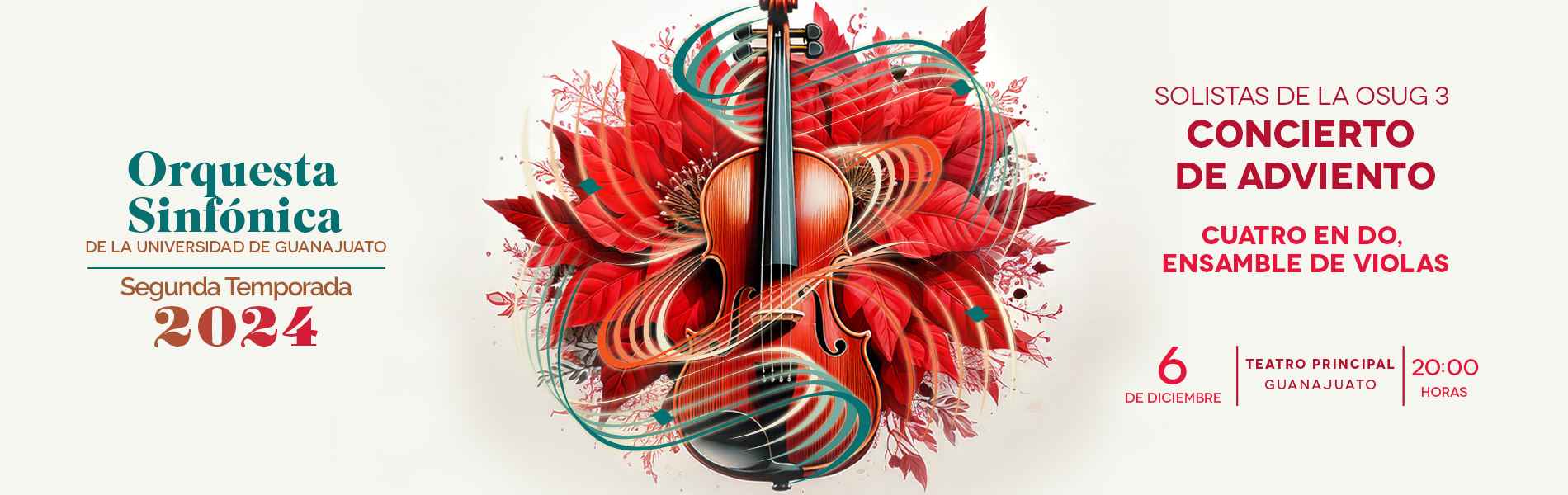 Solistas de la OSUG 3 ofrecerán su Concierto de Adviento, en el que participa Betsabé Jiménez Valencia, Lydia Bunn, Augusto Mirón y Óscar Pinedo, musico(a)s que interpretarán obras de Corelli, Tchaikovsky y villancicos tradicionales del mundo como Noche de paz, Mi burrito sabanero y muchos más, a realizarse el día 6 de diciembre a las 20:00 horas en el Teatro Principal.