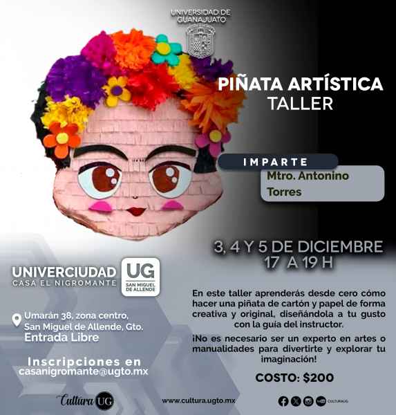 En Univerciudad UG Casa El Nigromante en San Miguel de Allende, se impartirá el Taller de Piñata Artística que ofrece el Mtro. Antonino Torres del 3 al 5 de diciembre de 17:00 a 19:00 horas, para los interesado(a)s, las inscripciones serán a través del correo Esta dirección de correo electrónico está protegida contra spambots. Usted necesita tener Javascript activado para poder verla.