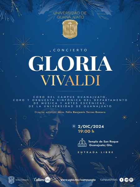 Finamente como parte de las actividades del Campus Guanajuato se presentará “Gloria de Vivaldi” con el Coro del Campus Guanajuato, el Coro y Orquesta Sinfónica del Departamento de Música y Artes Escénicas de la UG, a las 19:00 horas del 2 de diciembre en el Templo de San Roque y con entrada libre.