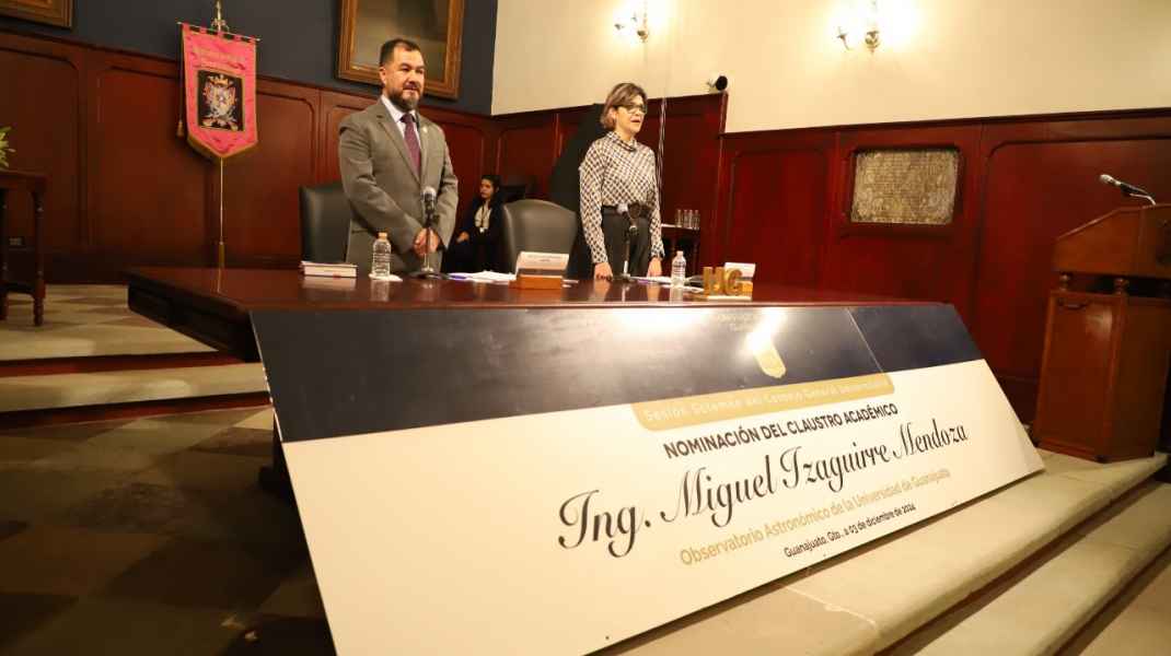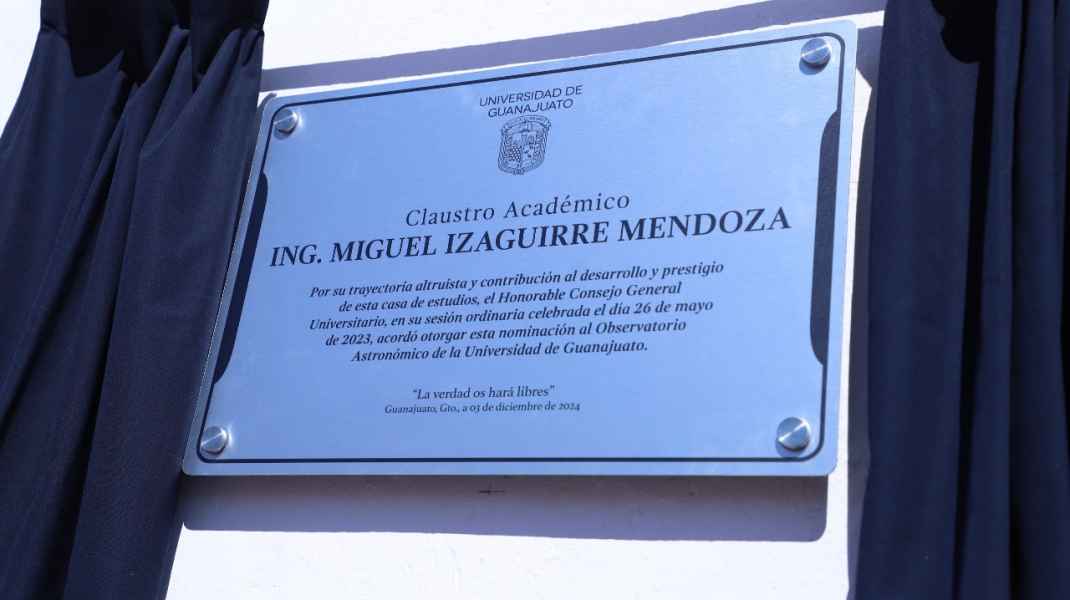 Guanajuato, Gto., a 03 de diciembre de 2024.- En Sesión del Consejo General Universitario, se llevó a cabo la nominación del Claustro Académico “Ing. Miguel Izaguirre Mendoza” al Observatorio Astronómico ubicado en el Edificio Central de la Universidad de Guanajuato (UG), acto que contribuye a honrar el legado de un destacado académico, cuyo trabajo se distinguió por su vocación docente, la divulgación del conocimiento y el compromiso social en todo su trabajo.