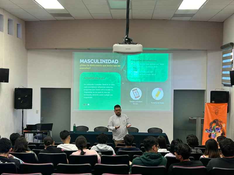 Guanajuato, Gto., a 06 de diciembre de 2024.- Interseccionalidad, consentimiento mutuo, cultura patriarcal, complicidad, argumentos naturalistas, abuso, privilegios y discriminación, entre otros, fueron los tópicos que se analizaron en el auditorio Sebastián Sanzberro Lastiri, de la División de Ciencias Económico Administrativas (DCEA) de la Universidad de Guanajuato (UG), esto durante la charla “Masculinidades 2.0” a cargo del Mtro. José Pérez Martínez.