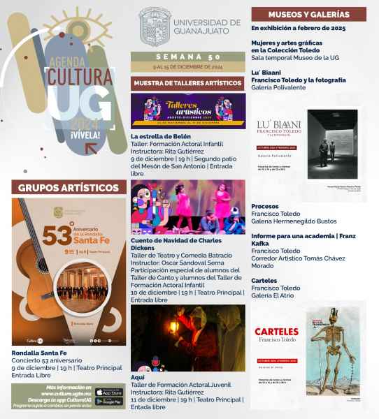 Finalmente, el “Concentus Nativitatis” del Coro del Campus Guanajuato, el Coro y Orquesta Sinfónica del Departamento de Música y Artes Escénicas de la UG engalanará el Templo de Belén el 09 de diciembre a las 20:00 horas.