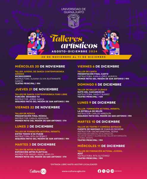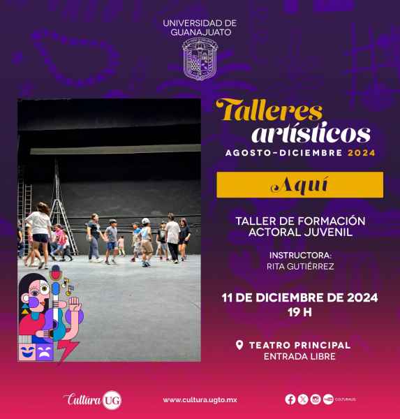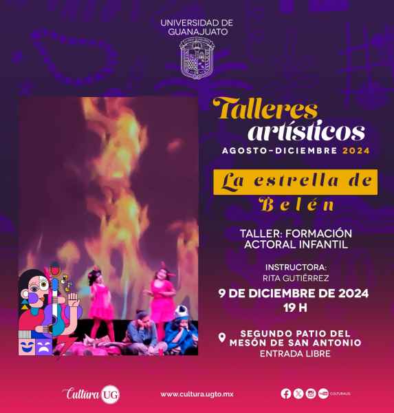 La muestra de talleres artísticos no puede faltar para cerrar este semestre con la puesta en escena “La estrella de Belén”, del Taller de Formación Actoral Infantil bajo la dirección de Rita Gutiérrez, el 09 de diciembre a las 19:00 horas en el segundo patio del Mesón de San Antonio con entrada libre. También presentarán la obra “Aquí” el 11 de diciembre a las 19:00 horas en el Teatro Principal.