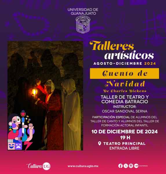 Una versión teatral del “Cuento de Navidad”, de Charles Dickens, será interpretada por el Taller de Teatro y Comedia Batracio, a cargo del instructor Óscar Sandoval Serna, con la participación especial de las y los alumnos del Taller de Canto y del Taller de Formación Actoral Infantil, el 10 de diciembre a las 19:00 horas en el Teatro Principal.