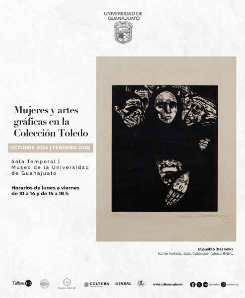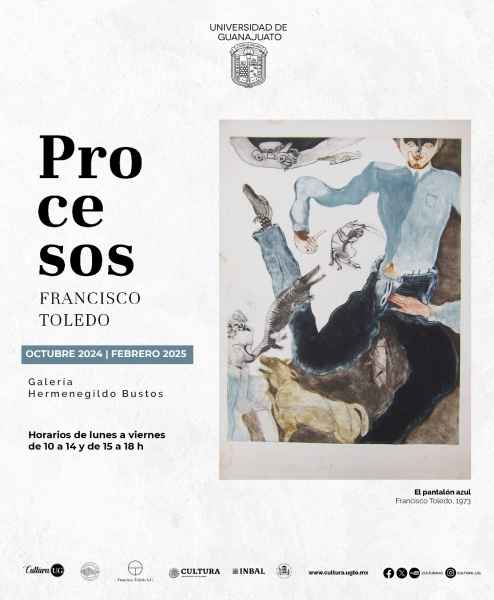 Asimismo, continúan disponibles las exposiciones con obra de la Colección Toledo/INBAL en las galerías universitarias: “Mujeres y artes gráficas en la colección de Toledo” en la Sala temporal del Museo de la UG; “Lu´ Bianni: Francisco Toledo y la fotografía” en la Galería Polivalente; “Procesos. Francisco Toledo” en la Galería Hermenegildo Bustos; “Informe para una academia | Franz Kafka” en el Corredor Tomás Chávez Morado y “Carteles. Francisco Toledo” en la Galería el Atrio.
