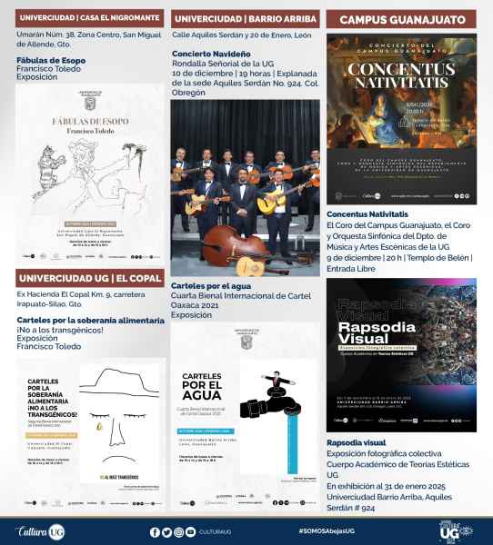 Paralelo a ello, continúan también las exposiciones en las Univerciudades UG: “Fábulas de Esopo” en Univerciudad Casa El Nigromante de San Miguel de Allende; “Carteles por el agua” y “Rapsodia Visual” en Univerciudad Barrio Arriba de León; y “Carteles por la soberanía alimentaria. ¡No a los transgénicos!” en Univerciudad El Copal de Irapuato.