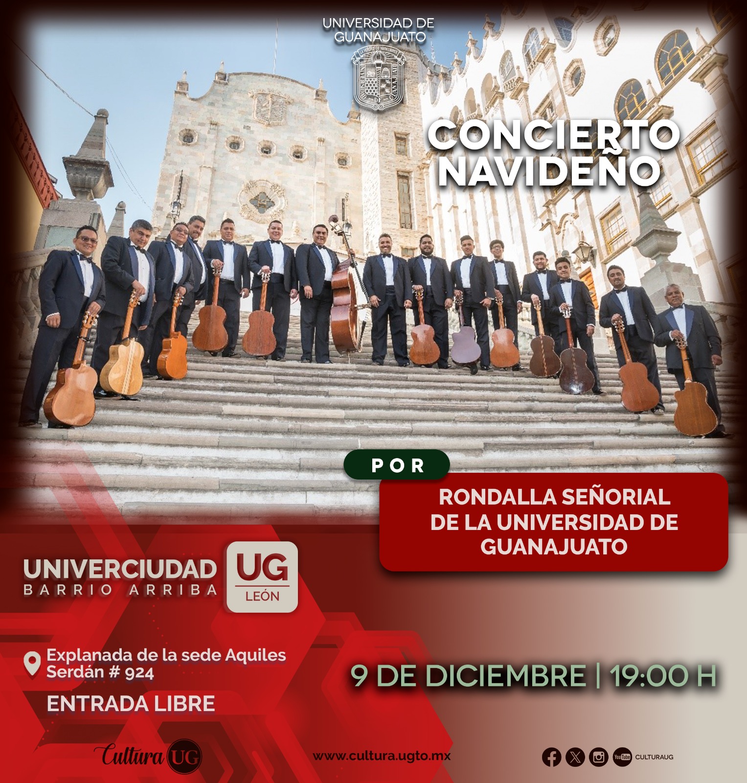 Por su parte, la Rondalla Señorial de la UG se presentará en la Univerciudad Barrio Arriba de León con su “Concierto Navideño” el próximo 10 de diciembre a las 19:00 horas en la Explanada de la sede Aquiles Serdán, núm. 924., col. Obregón.