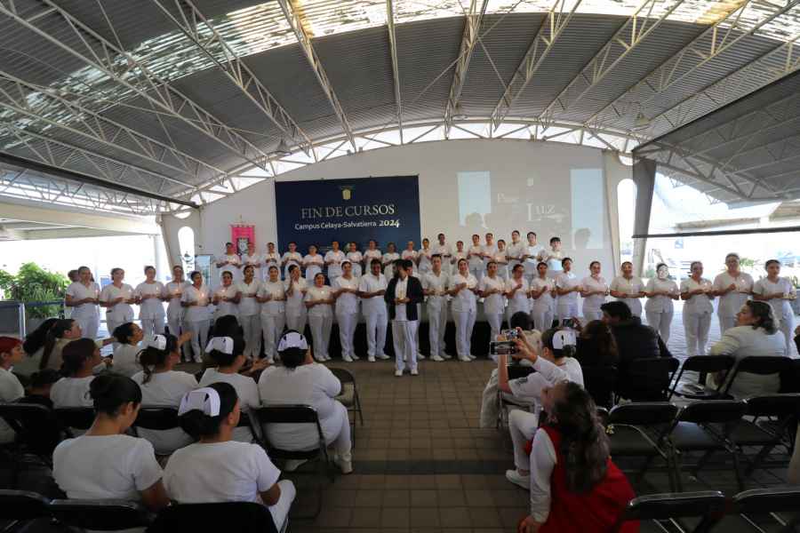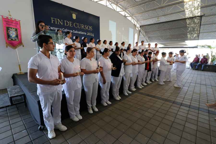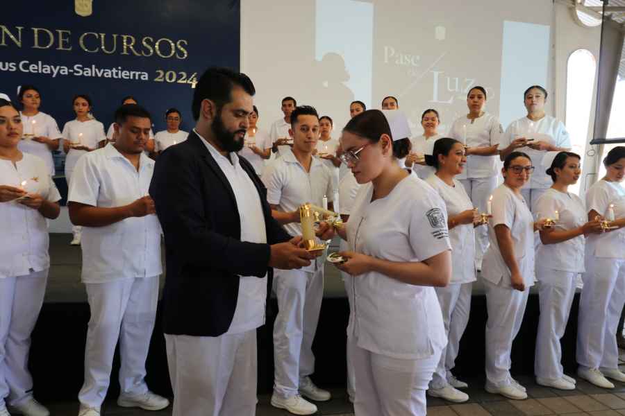 Celaya, Gto., a 11 de diciembre de 2024.- Noventa y siete estudiantes de la Licenciatura en Enfermería y Obstetricia del Campus Celaya-Salvatierra de la Universidad de Guanajuato (CCS UG) reciben la “luz del conocimiento” durante la tradicional ceremonia del Pase de la Luz.