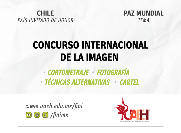 Guanajuato, Gto., a 11 de diciembre de 2024.- La Universidad Autónoma del Estado de Hidalgo (UAEH) y el Festival Internacional de la Imagen (FINI), en su décima cuarta edición, convocan al Concurso Internacional de la Imagen FINI 2025, el cual contempla cuatro géneros artísticos: Cartel (técnica libre), Fotografía (análoga o digital), Técnicas alternativas y Cortometraje, todos al respecto del tema “Paz mundial”.