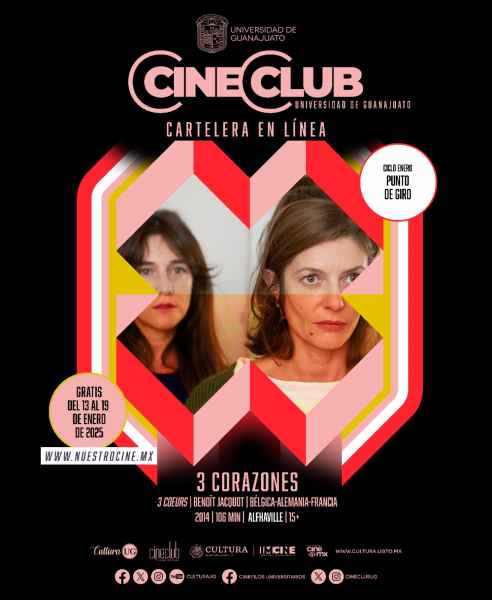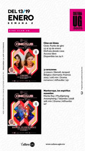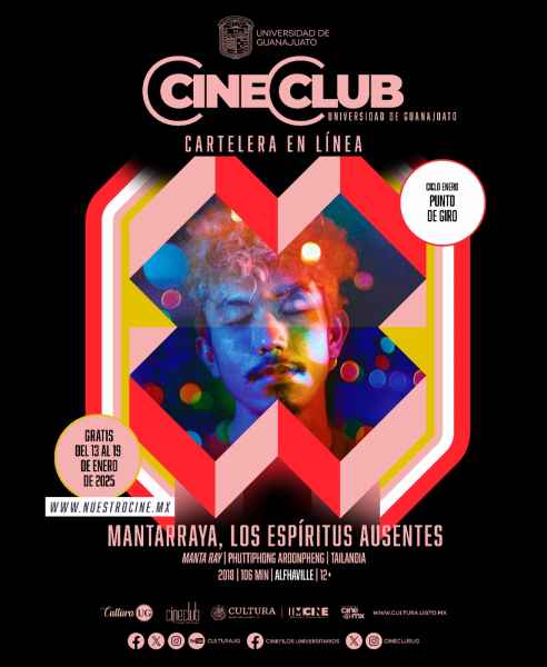 Guanajuato, Gto., a 10 de enero de 2025.- La Agenda Cultura de la Universidad de Guanajuato (ACUG) retoma sus actividades y contempla, en su primera semana, un programa de Cine en línea con dos películas llenas de romanticismo y enigma: 3 corazones (2014) y Mantarraya, los espíritus ausentes (2018), disponibles del 13 al 19 de enero.