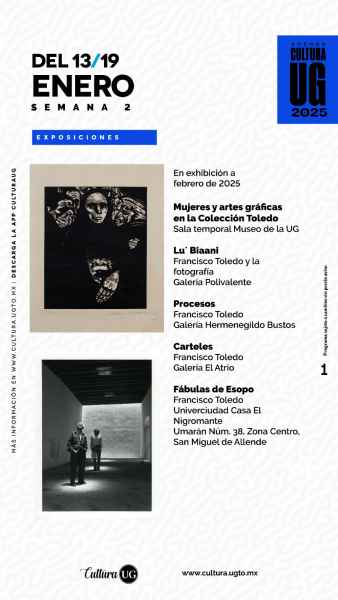Además del séptimo arte, continúan las exposiciones en las galerías universitarias. En estas se presenta la visión y el trabajo de Francisco Toledo como artista, coleccionista y gestor cultural. Para comenzar, “Lu´ Bianni: Francisco Toledo y la fotografía”, está instalada en la Galería Polivalente con 208 muestras del trabajo desarrollado por jóvenes en los espacios que fundó el maestro en Oaxaca.