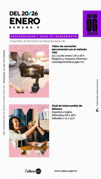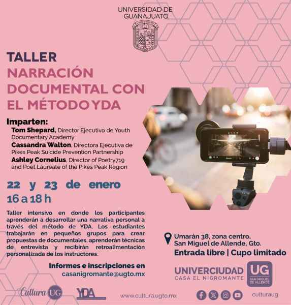 El inicio de semestre llega con dos nuevos talleres dirigidos al público general en San Miguel de Allende y León respectivamente: “Taller de narración documental con el método YDA”, los días 22 y 23 de enero de 16:00 a 18:00 horas en Univerciudad Casa el Nigromante (registro en Esta dirección de correo electrónico está protegida contra spambots. Usted necesita tener Javascript activado para poder verla.) y “Taller de autoestima”, para niñas y niños de 7 a 13 años, el 23 de enero a las 17:00 horas en la sede Aquiles Serdán 924 (registro en Esta dirección de correo electrónico está protegida contra spambots. Usted necesita tener Javascript activado para poder verla.).