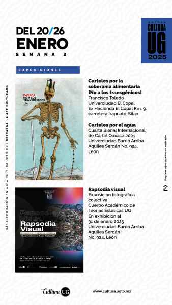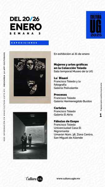 Quedan pocos días para disfrutar las ocho de las exposiciones con obra de la Colección Toledo/INBAL en las galerías universitarias, disponibles hasta el 31 de enero: “Mujeres y artes gráficas”, en el Museo de la UG; “Lu´ Bianni: Francisco Toledo y la fotografía”, en la Galería Polivalente; “Procesos. Francisco Toledo”, en la Galería Hermenegildo Bustos; “Carteles. Francisco Toledo”, en la Galería El Atrio; “Fábulas de Esopo”, en Univerciudad Casa El Nigromante, en San Miguel de Allende; “Carteles por la soberanía alimentaria”, Univerciudad El Copal, en Irapuato; y “Carteles por el agua”, en Univerciudad Barrio Arriba, en León, donde también está disponible “Rapsodia visual”, exposición fotográfica colectiva del Cuerpo Académico de Teorías Estéticas de la UG.