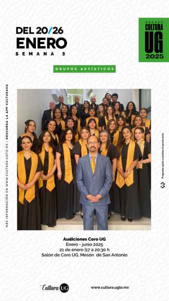 Guanajuato, Gto., a 17 de enero de 2025.- Esta semana, la agenda cultural de la Universidad de Guanajuato está llena de oportunidades para aprender y desarrollar talentos, comenzando por el Coro de la UG, el cual busca integrantes. Si te gusta cantar, asiste a las audiciones el martes 21 de enero de 17:00 a 20:30 horas en el salón de coro del Mesón de San Antonio.