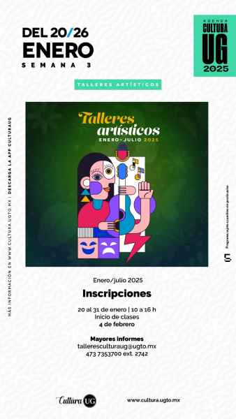 Si prefieres practicar otras artes, inscríbete a alguno de los talleres artísticos de la UG. Las inscripciones serán del 20 al 31 de enero de 10:00 a 16:00 horas y las clases iniciarán el 4 de febrero en Guanajuato capital. Se puede solicitar más información a través del correo electrónico Esta dirección de correo electrónico está protegida contra spambots. Usted necesita tener Javascript activado para poder verla. y la línea telefónica 473 7353700, extensión 2742.