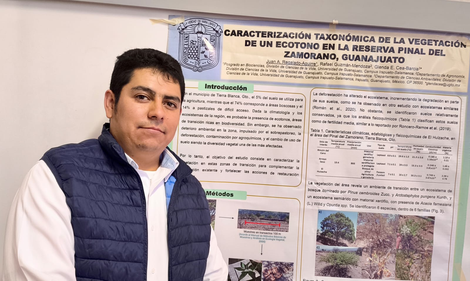 Irapuato, Gto., a 30 de enero de 2025.- Juan Alberto Regalado Aguirre, estudiante del doctorado en Biociencias del Campus Irapuato-Salamanca de la Universidad de Guanajuato, ha realizado un estudio para caracterizar la vegetación en El Pinal del Zamorano, una reserva ecológica en el noreste del estado. Su proyecto, titulado “Caracterización taxonómica de la vegetación de un ecotono en la reserva Pinal del Zamorano, Guanajuato”, se centró en estas zonas de transición para complementar la información existente y fortalecer las acciones de restauración ecológica.