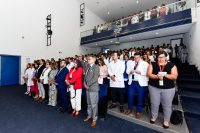 León, Gto., 18 de febrero de 2025.-. El Auditorio Jorge Ibargüengoitia del Campus León de la Universidad de Guanajuato (UG) fue sede de la ceremonia de fin de cursos de los programas educativos de especialidades médicas, en la cual 834 residentes de diversas especialidades concluyeron sus estudios. Además, se entregaron reconocimientos a las sedes clínicas y a las y los médicos residentes que publicaron sus trabajos de investigación.