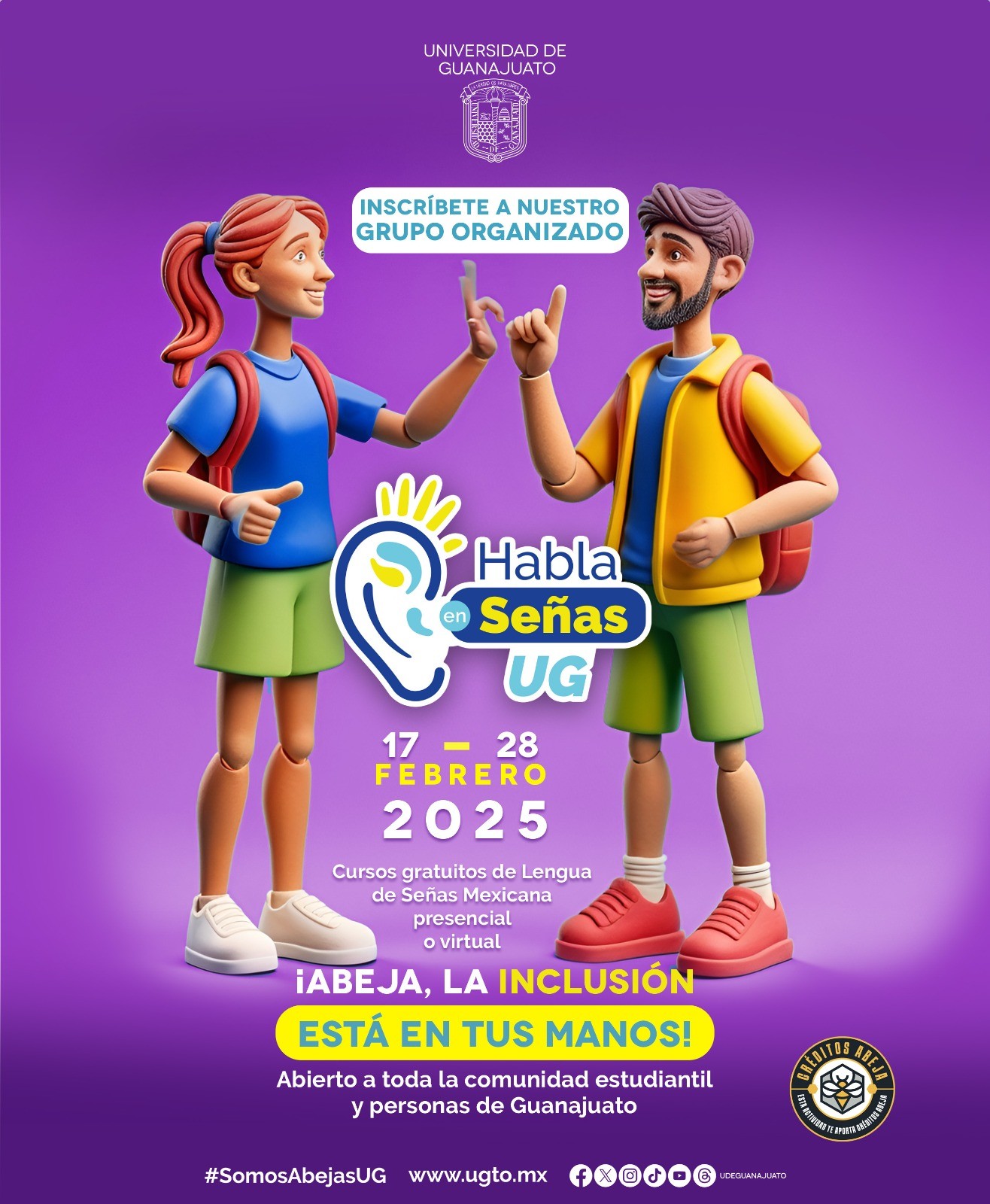 Guanajuato, Gto., a 25 de febrero de 2025.- El Grupo Organizado “Habla en Señas” de la Universidad de Guanajuato (UG) invita a ser parte de los cursos gratuitos de Lengua de Señas Mexicana (LSM), acción que busca promover la participación de la comunidad estudiantil y público en general, como parte de su compromiso con la educación inclusiva.