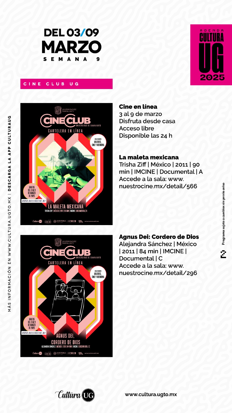 La agenda de esta semana también presenta el séptimo arte con su programa “Cine en línea” para disfrutar desde casa y en cualquier horario. Del 3 al 9 de marzo, estarán disponibles las obras documentales La maleta mexicana, de Trisha Ziff (acceso: https://www.nuestrocine.mx/detail/566 ), y Agnus Dei: Cordero de Dios, de Alejandra Sánchez (acceso: www.nuestrocine.mx/detail/296).