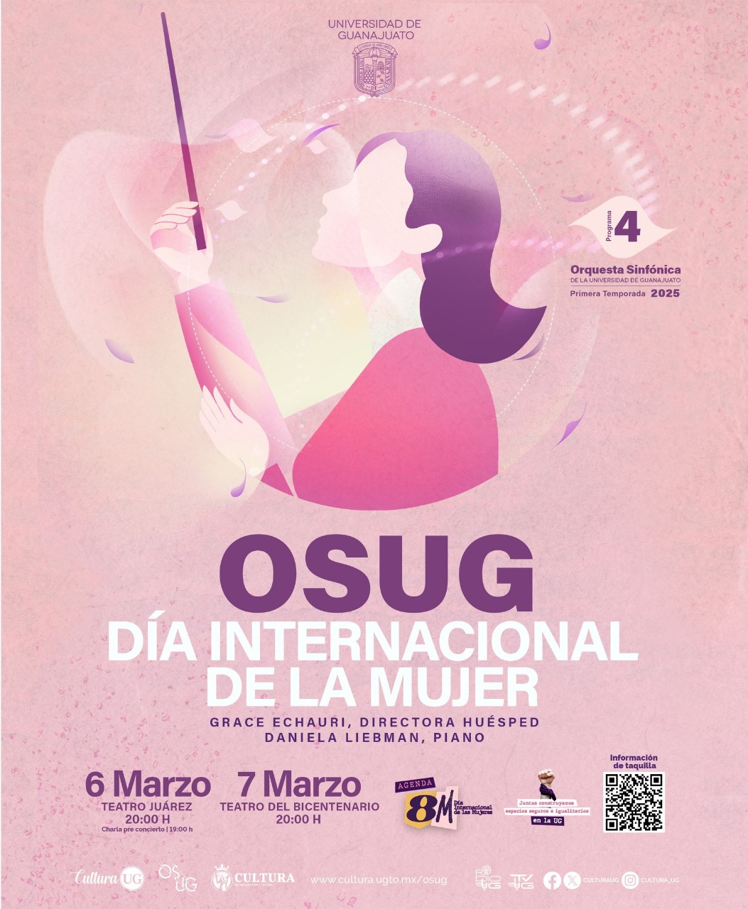 En esta ocasión, como parte de la conmemoración por el Día Internacional de la Mujer (8M), la OSUG otorgará la batuta a la directora Grace Echauri para rendir homenaje a dos grandes compositoras de la historia musical, Fanny Mendelssohn y Clara Wieck Schumann, además de estrenar en Guanajuato dos obras de creadoras mexicanas: Ana Lara y Gina Enríquez; todo esto en compañía de la reconocida pianista Daniela Liebman.
