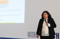 Durante su exposición la doctora León Andrade enumeró los ejes de desarrollo que contempla su plan de trabajo, con aspectos como el aumento del índice terminal, el fortalecimiento y acompañamiento del sistema de tutorías, la continuidad en el proceso de capacitación de la planta académica del departamento integrando el desarrollo de herramientas de aprendizaje y el uso de nuevas tecnologías.