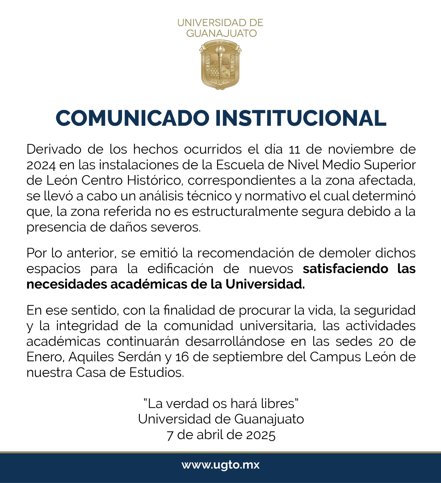 Inicio | QUEHACER INSTITUCIONAL | Comunicado Institucional