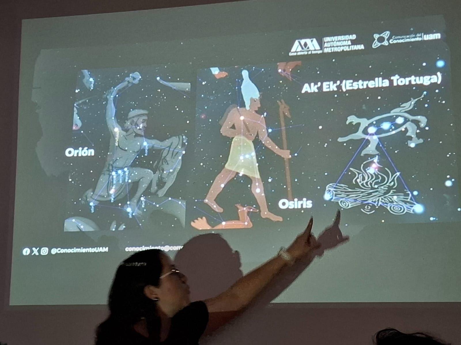 Guanajuato, Gto., a 08 de abril de 2025.- En el marco de la Feria Internacional del Libro de la Universidad de Guanajuato (FILUG), personal de la Dirección de Comunicación del Conocimiento de la Universidad Autónoma Metropolitana (UAM) compartió un panorama de las cosmovisiones prehispánicas y la mitología griega en la charla “Entre mitos y leyendas: Recorrido por el cielo de primavera”, la cual se complementó con una noche de observación astronómica con telescopios, en la cual se contó con el apoyo del Departamento de Astronomía de la máxima Casa de Estudios en el Estado.
