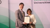 Como muestra del agradecimiento por la alianza institucional, la UG, con la representación de la Rectora General, entregó un reconocimiento al Dr. Brett Favaro, de la Kwantlen Polytechnic University, el cual representa el fortalecimiento de la relación binacional.