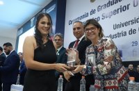 La Rectora General de la Universidad de Guanajuato (UG), Dra. Claudia Susana Gómez López, entregó el reconocimiento a la mejor alumna de la primera generación, Nancy Paola Segura Cleto.