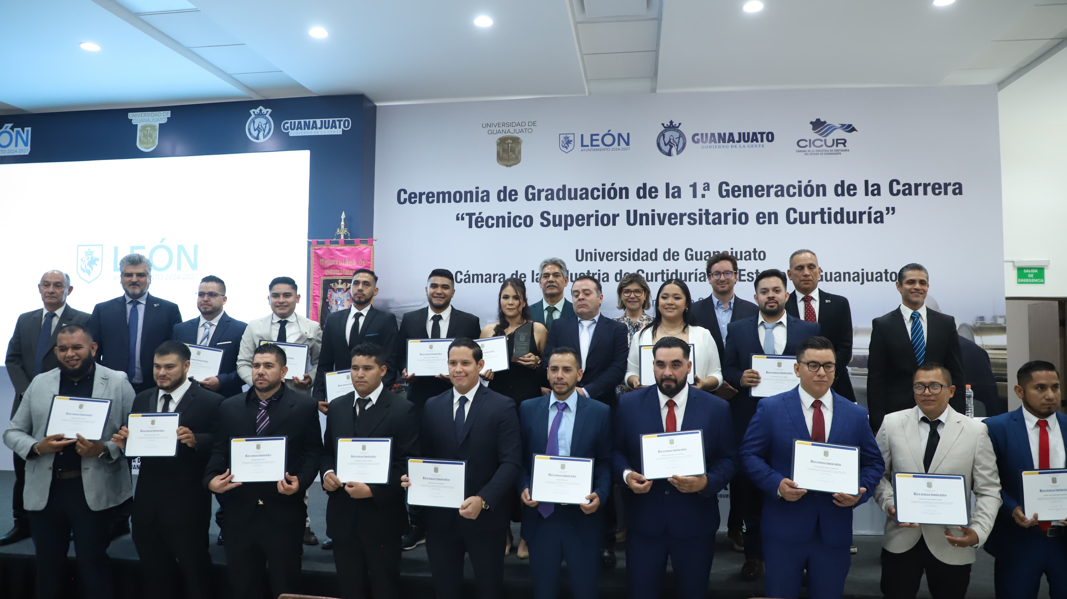 Guanajuato, Gto., a 29 de mayo de 2025.- Con orgullo, 17 jóvenes provenientes de siete empresas curtidoras del estado, pertenecientes a la primera generación del programa académico de Técnico Superior Universitario (TSU) en Curtiduría, de la División de Ciencias e Ingenierías (DCI) del Campus León de la Universidad de Guanajuato (UG), participaron en su ceremonia de graduación. Este emotivo evento se realizó en compañía de familiares, docentes, empresario(a)s del ramo de la curtiduría, así como autoridades estatales y municipales.