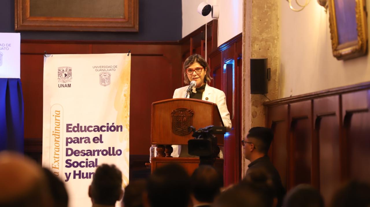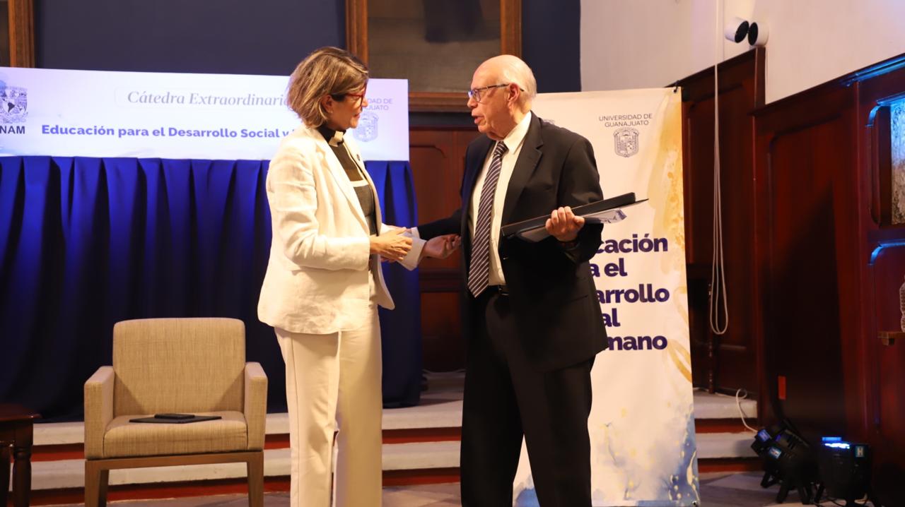 Guanajuato, Gto., a 10 de junio de 2025.- El Salón del Consejo General Universitario de la Universidad de Guanajuato (UG) fue sede de la conferencia "El desarrollo social y la educación en México. ¿Qué hacer para avanzar?", impartida por el Dr. José Narro Robles, Exrector de la Universidad Nacional Autónoma de México (UNAM), esto como parte de la Cátedra Extraordinaria “Educación para el desarrollo social y humano", establecida por la UG y la Máxima Casa de Estudios del país.