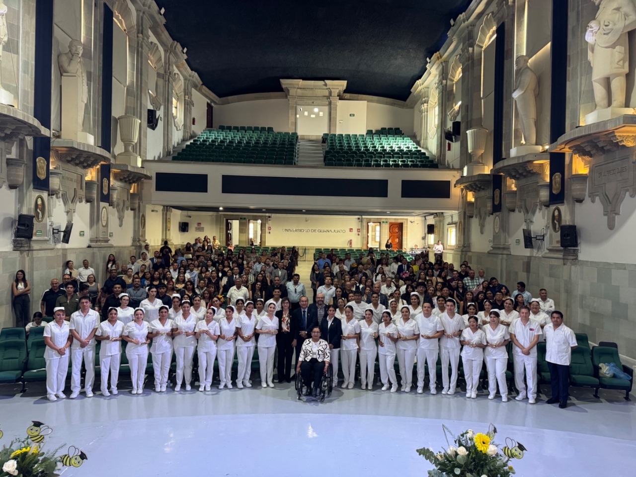 Guanajuato, Gto., a 13 de junio de 2025.- En el Auditorio General de la Universidad de Guanajuato (UG), se realizó la emblemática ceremonia de ‘pase de luz’ e imposición de cofias a las y los estudiantes del grupo octavo A de la generación 2021-2025 de la Licenciatura en Enfermería y Obstetricia, impartida en el Campus Irapuato-Salamanca (CIS) de esta institución.