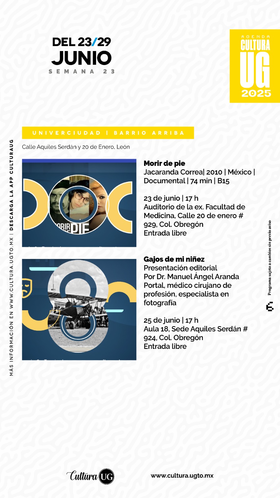 La cartelera está sujeta a cambios sin previo aviso. Se recomienda consultar actualizaciones en el sitio oficial www.cultura.ugto.mx o a través de la app Cultura UG.