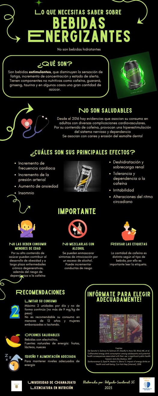 Guanajuato, Gto., a 22 de julio de 2025.- Las llamadas ‘bebidas energéticas’ producen un efecto estimulante debido a su alto contenido de azúcar, cafeína y otras sustancias como la taurina, guaraná y ginseng. Estos ingredientes inhiben las señales de cansancio que el cuerpo emite cuando necesita descanso, lo que puede llevar a un uso excesivo con consecuencias perjudiciales para la salud, advirtió la Dra. Silvia del Carmen Delgado Sandoval, profesora de la Licenciatura en Nutrición de la Universidad de Guanajuato (UG), en el Campus Celaya-Salvatierra.