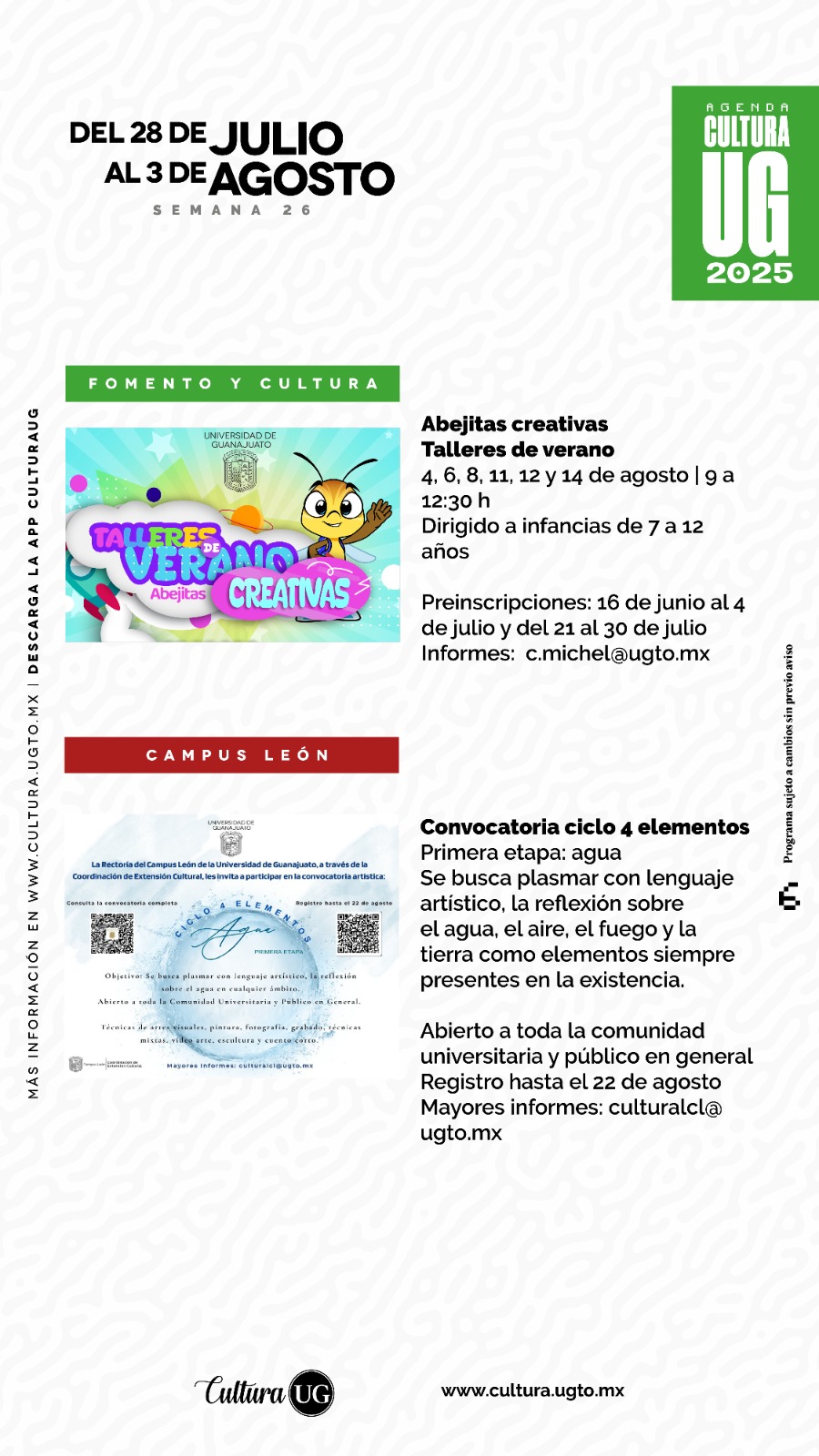 La programación está sujeta a cambios sin previo aviso. Se recomienda consultar actualizaciones en el sitio oficial www.cultura.ugto.mx, en redes sociales o en la aplicación @Cultura UG.