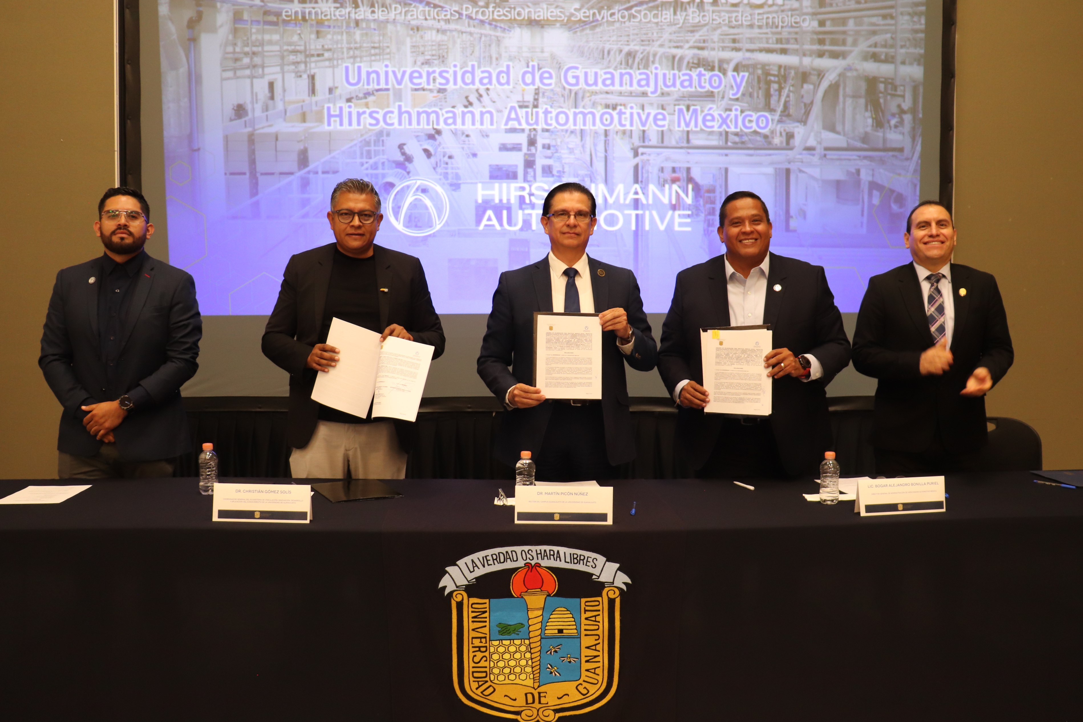 Anterior a la firma del convenio, las palabras de bienvenida estuvieron a cargo del Dr. Christian Gómez Solís, Coordinador General del el Ecosistema VIDA UG. La presentación de la empresa fue realizada por el Lic. Héctor Mayerstein, Jefe de Recursos Humanos en Hirschmann Automotive México, quien, junto con el Lic. Bogar Alejandro Bonilla Puriel, Director General de Administración, respondieron algunas dudas de la asistencia.