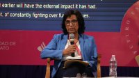 Guanajuato, Gto., a 11 de septiembre de 2025.- Dentro del 4º Encuentro de Rectoras “Tejiendo lazos de igualdad para un futuro de paz”, celebrado en la Universidad de Guanajuato (UG), se desarrolló el panel “Voces de liderazgos femeninos. Crisis institucionales y gobernanza para las IES mexicanas”, a fin de reflexionar sobre el accionar de las mujeres desde los puestos de liderazgo dentro de las instituciones de educación superior, lo que ha llevado a replantear las formas de organización y gobernanza universitaria, resaltando la integración.