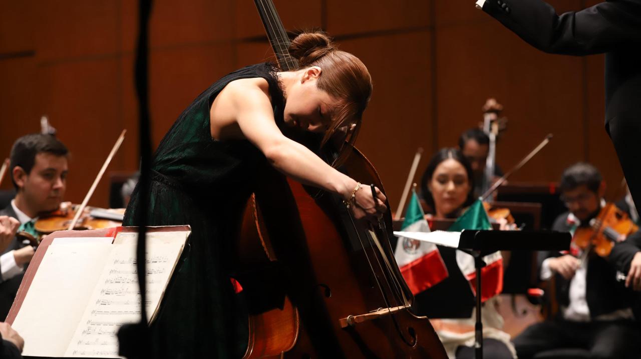 El entusiasmo se mantuvo en el recinto con la entrada de la solista surcoreana Mikyung Sung, embajadora del contrabajo contemporáneo, reconocida por su virtuosismo técnico, sensibilidad interpretativa, presencia escénica y carisma. Su carrera inició a temprana edad y se consolidó pronto como una de las figuras más destacadas del contrabajo clásico contemporáneo, además de ser ganadora de múltiples concursos internacionales.